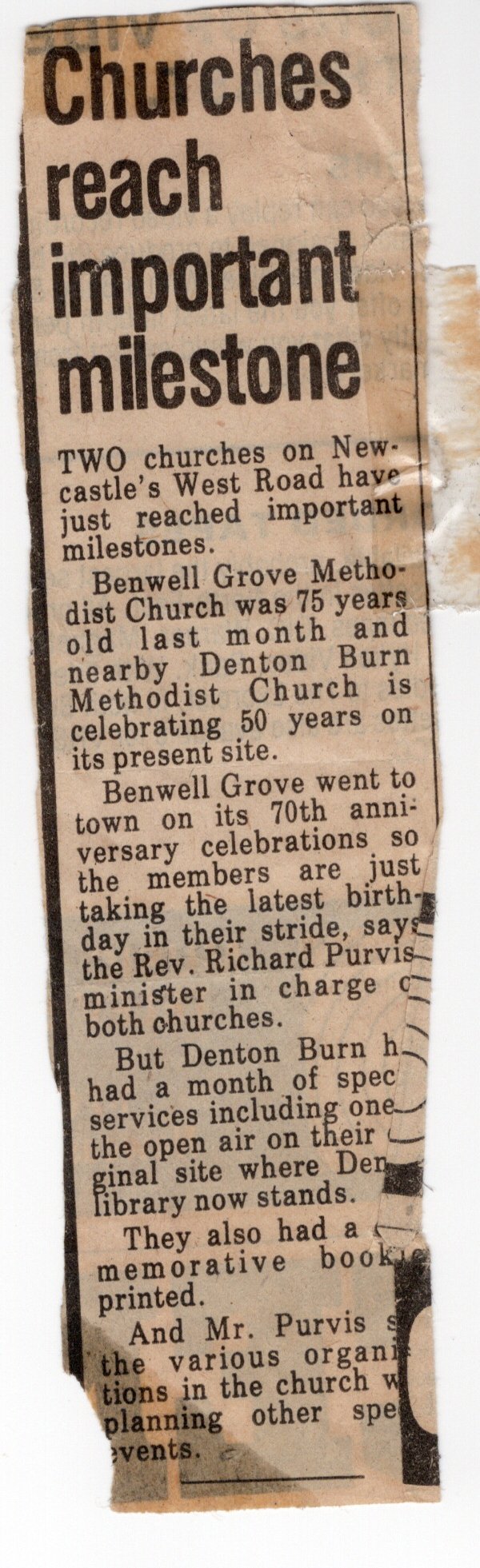 The earliest surviving reference to Denton Bum is in a Blenheim Street Circuit Preaching Plan for 1867. Later Wesleyan Methodist archives contain references to worship in a cottage at Denton Bum in the early 1880's organised by Prayer Leaders from the Elswick Road Church. Attempts were made from time to time to find a site and build a chapel for the Methodist faithful. Towards the end of the decade, however, the circuit officials grasped the problem and on 18* June 1889 resolved "that this meeting recommends to the proposed Trustees for Denton Burn that the scheme for building a Chapel to accommodate about 75 and at a cost of 120 be proceeded with immediately and with all prudence. " The first chapel was built on the south side of the West Road close to the old Denton Bum. It was opened about September 1889 and cost £165; the debt was cleared within twelve months. One of the first trustees was William Haswell Stephenson. The society was established!